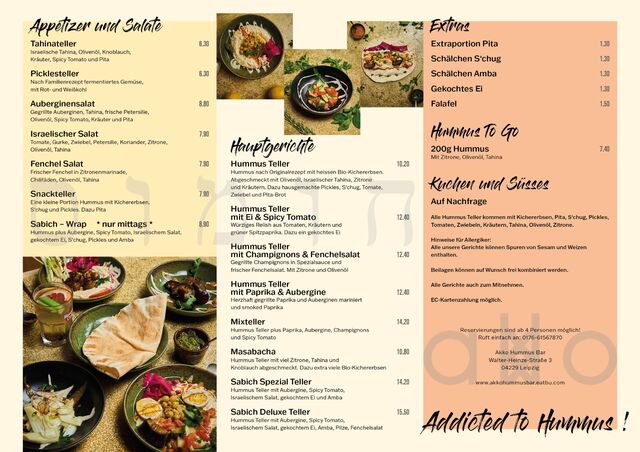 Verbringen Sie bei uns einen Abend mit vielfältiger oder mediterraner Küche und all ihren kulinarischen Feinheiten. Köstliche Gerichte in einem schönen Ambiente bieten wir Ihnen im Biergarten AKKO Hummus Bar. Das gute Wetter genießen können Sie in unserem schönen Außenbereich.