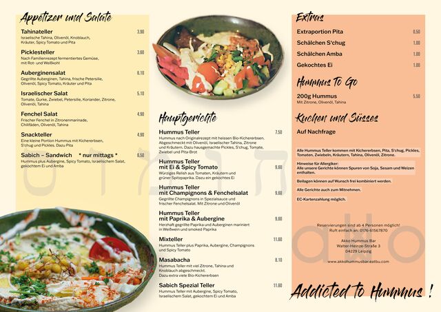 Verbringen Sie bei uns einen Abend mit vielfältiger oder mediterraner Küche und all ihren kulinarischen Feinheiten. Köstliche Gerichte in einem schönen Ambiente bieten wir Ihnen im Biergarten AKKO Hummus Bar. Das gute Wetter genießen können Sie in unserem schönen Außenbereich.